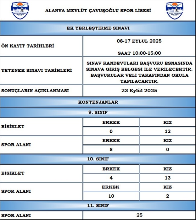 9, 10 ve 11. sınıf seviyelerinde ek yetenek sınavı yapılacaktır.